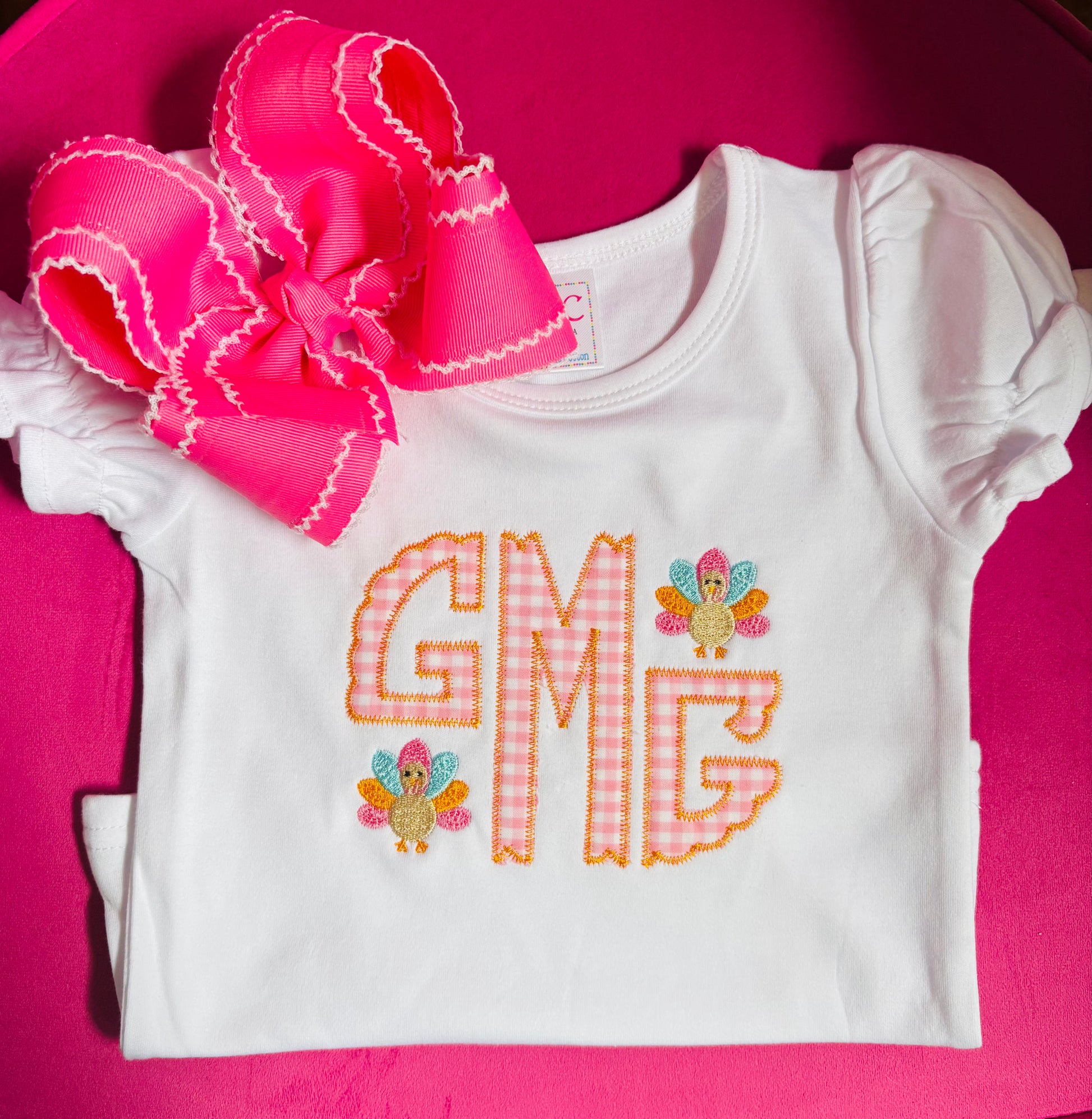 Your little one will be ready for all the fall festivities in our Turkey Twirls Top. Fun embroidered turkeys accent the scalloped edge offset monogram and add the perfect touch of timeless charm. This top pairs beautifully with bloomers, gingham pants, or a twirly skirt for Thanksgiving gatherings or fall parties.